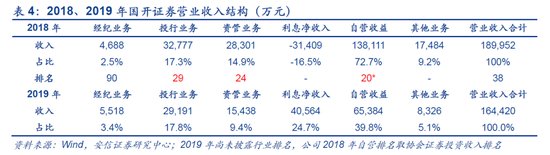 公司优势业务为投行和资产管理。从证券业协会排名来看,2018年公司资产排名行业第38名,净资产排名行业第30名,营业收入和净利润分别为38名和23名。2018年公司实现营业收入19亿元,其中自营业务收入38.5亿元,资管业务和经纪业务占比分别为22.2%和21.9%,投行业务收入为14.8%。2018年公司投行、资管和自营收益排名在行业前20名,表现相对突出。2019年公司收入结构中投行业务收入保持稳定,资管业务收入出现下滑。
