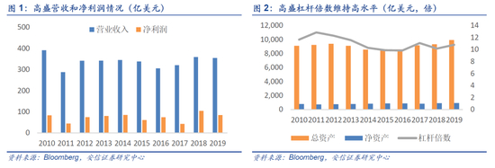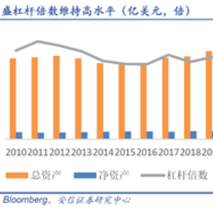 2019年总营收为355亿美元,在净利润方面,2019年底为86亿美元,比起2018年均略有下降,当年ROE为9.38%。至2019年底,高盛集团总资产达9930亿美元,净资产达920亿美元,杠杆倍数为10.8倍。虽然自2009年后高盛,高盛逐步调整结构,轻资产业务营收占公司总收入比重由21%提高至2018年的41%,但集团杠杆倍数仍维持在十倍左右的杠杆率水平。高盛集团的机构客户服务和投资与借贷服务是公司耗用资本金较多的重资产型业务,合计资产占用达到公司总资产的98%。