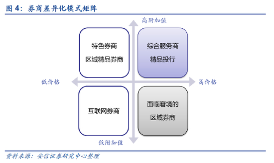 从海外经验来看,券商可以分成四类:(1)综合服务商和精品投行所开展的业务具有一定门槛效应,提供最高品质且昂贵的服务;(2)特色券商和区域精品券商在细分市场中能提供不亚于大券商的高性价比的服务;(3)互联网券商通过技术手段降低运营成本,提供标准化且廉价的产品和服务,以量取胜;(4)多数区域券商虽然具有一定地域优势,但难以提供更高性价比的服务,容易在竞争中处于不利位置。