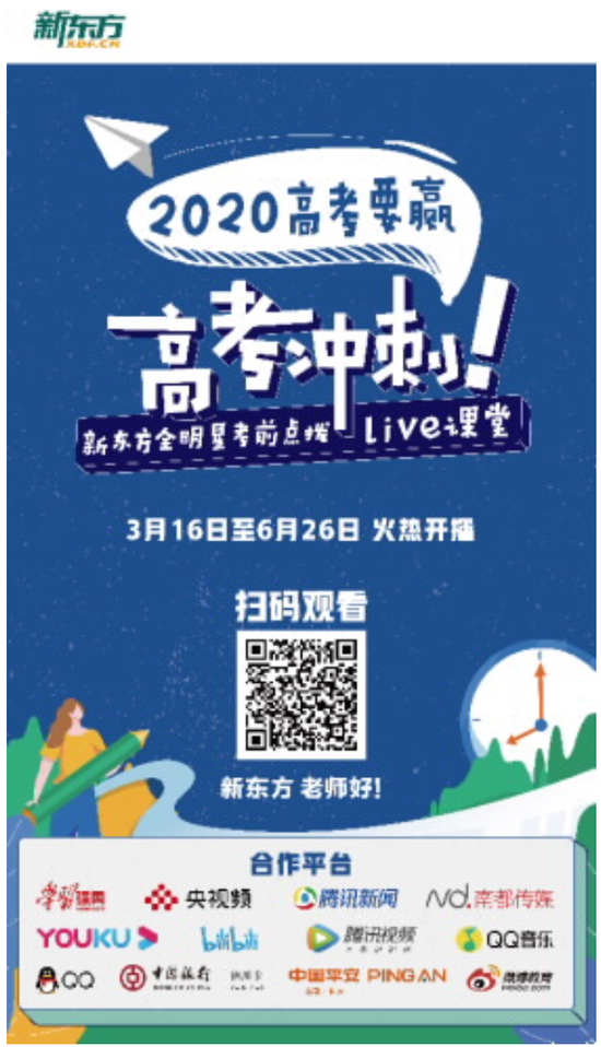 为了帮助考生在最后的高考冲刺阶段更好地进行备考,缓解压力带来的焦虑等情绪,新东方集结全国高考名师,于教育行业率先推出高考全学科公益直播课程:高考冲刺——新东方全明星考前点拨live课堂,期待课程能够成为考生们在校内复习之外的有益补充,为他们赢得高考助一臂之力。