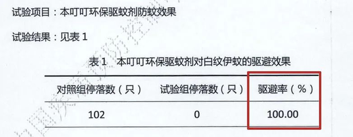 经过检测,用本叮叮环保驱蚊剂后,用羽化后4~7天未吸血的雌性白纹伊蚊成虫测试。