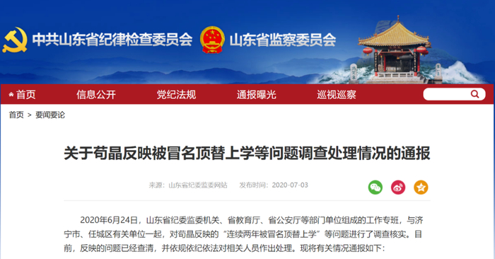 2020年6月24日,山东省纪委监委机关、省教育厅、省公安厅等部门单位组成的工作专班,与济宁市、任城区有关单位一起,对苟晶反映的“连续两年被冒名顶替上学”等问题进行了调查核实。目前,反映的问题已经查清,并依规依纪依法对相关人员作出处理。现将有关情况通报如下: