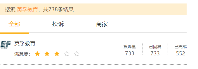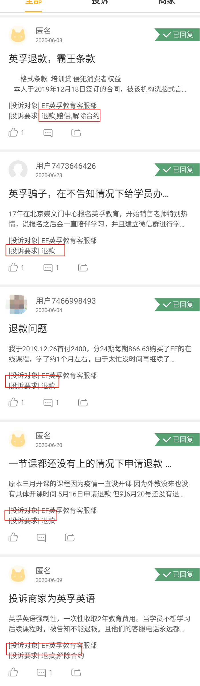其中已完成的投诉案例为11例,完成比例为15.71%;近60条投诉信息仅仅显示为“已回复”状态,这说明英孚教育与学员的沟通还在继续,双方尚未就解决方案达成一致。