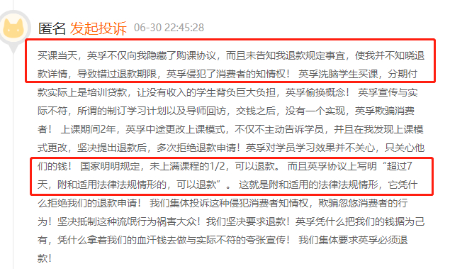 一投诉用户发起集体诉讼,他表示,购买课程当天,英孚教育销售人员未告知其退款事宜,使其错过退款期限;国家明确规定未上满课程的1/2,可以退款;此外,英孚教育协议上写明“超过7天,符合适用法律法规情形的,可以退款”。