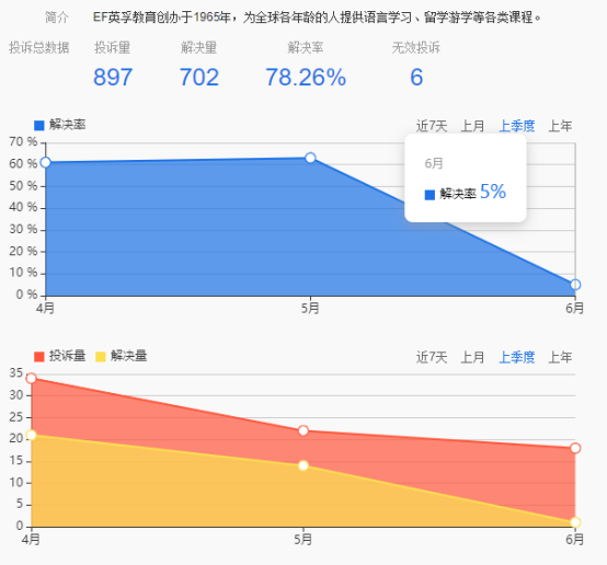 据聚投诉平台数据,英孚教育6月份共有18条投诉信息,已解决的投诉仅仅只有1条,解决率由5月份的63%急剧下滑至5%,下滑幅度为58%,这意味着英孚教育不能及时解决学员的投诉问题。