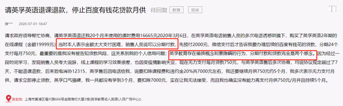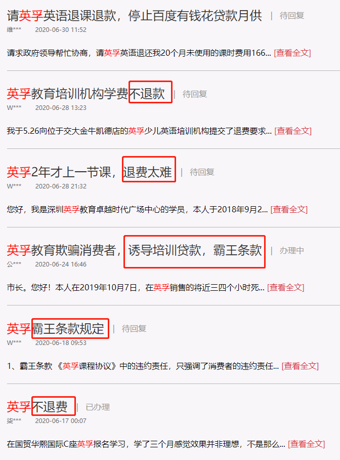 事实上,刘女士与雯雯的“教育贷”并非个例,有多位学员在人民网领导留言板块、聚投诉、黑猫投诉等消费者投诉平台投诉英孚教育,投诉的内容包括:诱导贷款、退款难、霸王条款等等。