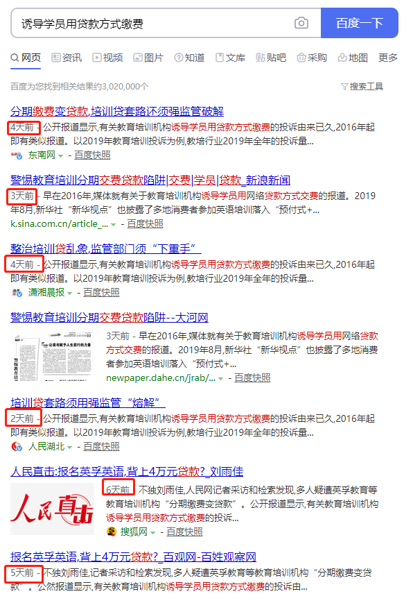 在百度搜索输入关键词“诱导学员用贷款方式缴费”可以搜出高达逾300多万条信息,最新的信息均为本周内,虽然许多学员苦于“教育套路贷”已久,但是该问题仍然没有能够得到很好的解决。