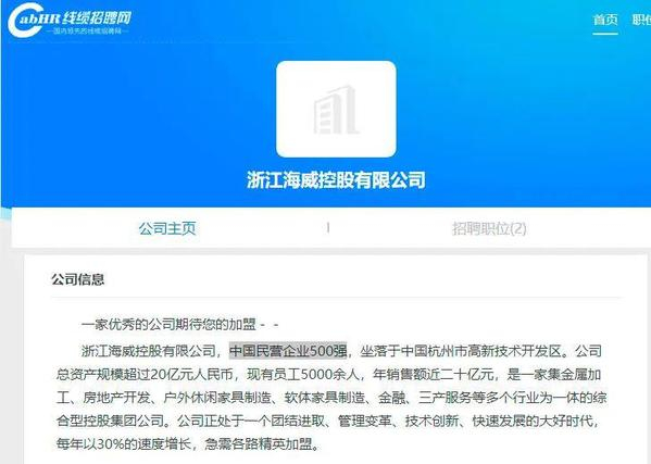 而网上公布的招聘信息还显示,“浙江海威控股有限公司,中国民营企业500强,坐落于中国杭州市高新技术开发区。公司总资产规模超过20亿元,现有员工5000余人,年销售额近二十亿元,是一家集金属加工、房地产开发、户外休闲家具制造、软体家具制造、金融、三产服务等多个行业为一体的综合型控股集团公司。”