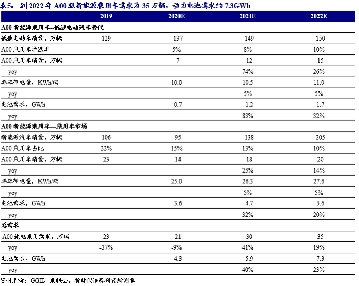 根据我们的测算,到2022年A00级新能源乘用车需求为35万辆,动力电池需求约7.3GWh。