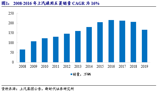 上汽通用五菱深挖消费需求,精准把握细分市场,销量保持年化16%的高增长。上汽通用五菱下游有“五菱”和“宝骏”两大品牌,涵盖微型货车、MPV、轿车和SUV,产品主打10万元以下市场。通过源源不断地推出深受消费者认可的车型:如五菱之光、五菱荣光、五菱宏光以及宝骏品牌的宝骏310、510、560和730等,上汽通用五菱汽车销量从2008年的65万辆增长到高峰2016年的215万辆,CAGR达到16%。