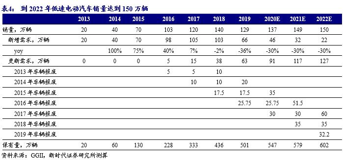 根据我们的测算,我们预计到2022年低速电动汽车需求达到150万辆。