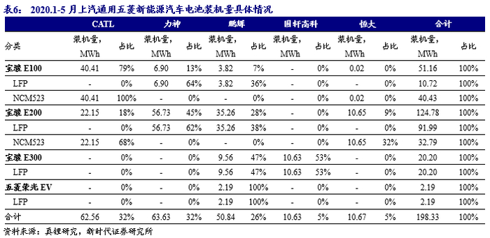 上汽通用五菱动力电池主要由CATL、力神和鹏辉三家供应。1)从装机总量上看,根据真锂研究统计数据,2020.1-5月上汽通用五菱TOP3电芯供应商分别为CATL、力神和鹏辉,占比分别为32%、32%和26%,合计约为89%。其余由国轩高科和恒大供应。2)按供应电池种类分,LFP电池中力神、鹏辉和国轩高科分别占比51%、41%和8%,三元电池中CATL和恒大占比分别为85%、15%。