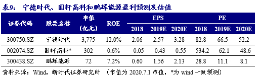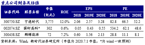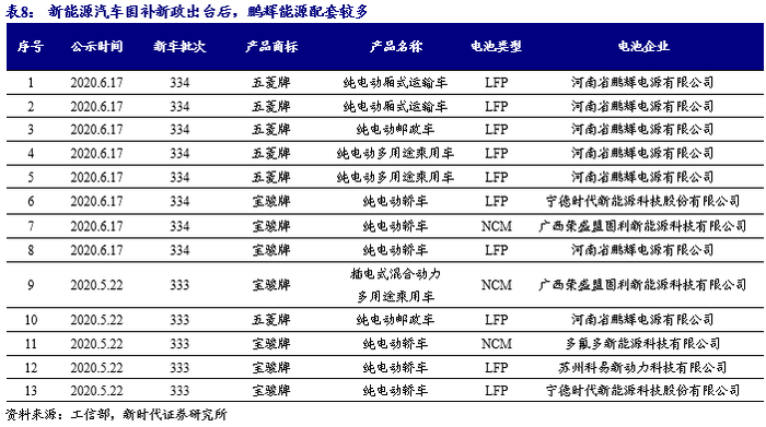 新车配套中鹏辉能源、CATL和华霆动力占比大。根据2020年1-6月的新能源汽车新车的公示统计,鹏辉能源、CATL和华霆动力占据前三,分别配套10、4、4款新车型。其中,鹏辉能源分别配套6款纯电乘用车和4款纯电运输车和邮政车,均为LFP电池;CATL配套1款纯电SUV、2款纯电轿车和1款纯电运输车,均为LFP;华霆动力配套4款纯电轿车,其中2款为LFP,2款NCM。根据电池中国披露,宏光mini的电池包主要由华霆动力提供,其电芯主要由国轩高科等提供。受4月23日国补新政出台的影响,部分车型可能存在调整。从补贴出台后5、6月份的新车公示(第333、334批)来看,鹏辉能源配套车型进入新车公告的进度较多。