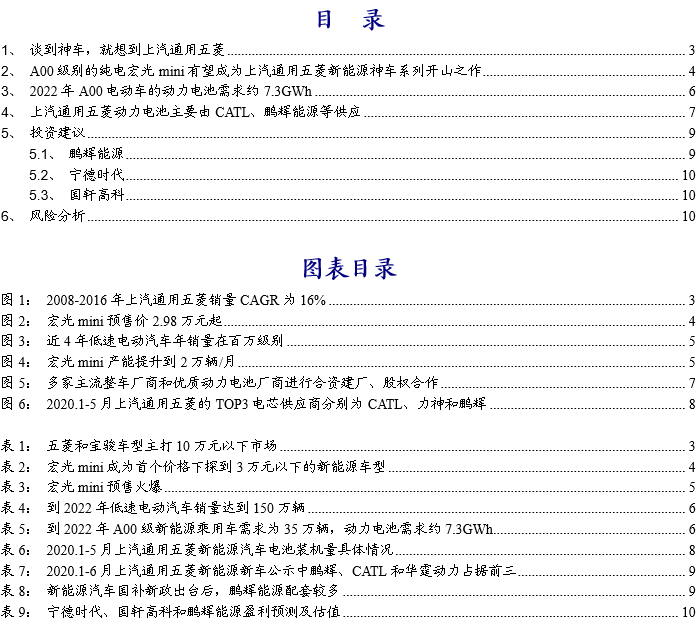我们推荐1)和上汽通用五菱进行战略合作、产品配套处于上升期的鹏辉能源,2)锂电行业龙头、和上汽集团深度合作的宁德时代。受益公司有上汽通用五菱战略合作供应商、大众入股迎来黄金发展期的国轩高科。