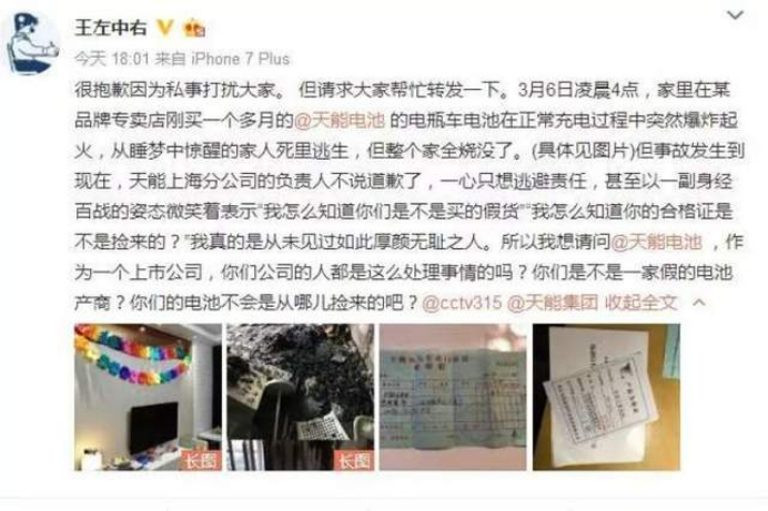 2018年3月,微博大V“王左中右”称,“家里在某品牌专卖店刚买一个多月的天能电池的电瓶车电池在正常充电过程中突然爆炸起火,从睡梦中惊醒的家人死里逃生,但整个家全烧没了”。