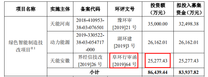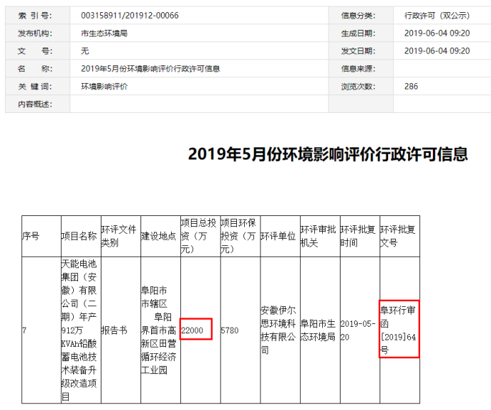 根据阜阳市人民政府披露,阜环行审函[2019]64号环评批复对应项目正是天能安徽的“年产912万kVAh铅酸蓄电池技术装备升级改造项目”,但该项目的总投资金额仅22000万元,为招股书披露投资金额的87.03%。
