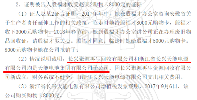 裁判文书称,长兴聚源和浙江省长兴天能电源有限公司(以下简称“天能电源”)均为天能电池集团有限公司(天能股份曾用名)子公司,因长兴聚源新成立,财务系统不健全,故由天能电源支出相关费用。