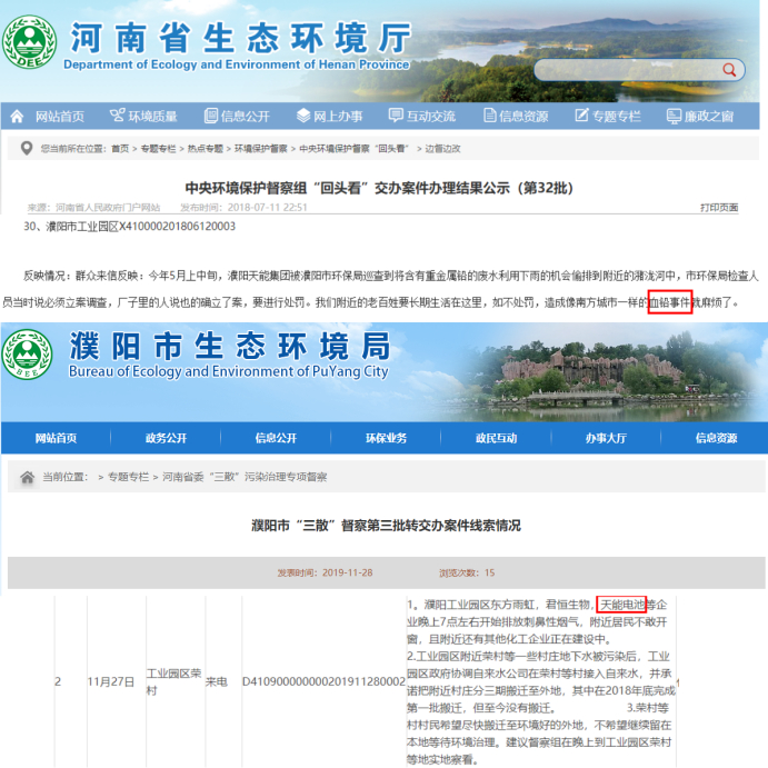 2016年10月,苏北环保督察中心执法人员检查发现,浙江天能电池(江苏)有限公司2015年未经省级环保部门批准擅自(超审批量)转移845.16吨危险废物,故对其罚款10万元。2018年5月,濮阳市环保局巡查发现,天能集团(河南)能源科技有限公司(以下简称“天能河南”)将含有重金属铅的废水利用下雨的机会偷排到附近的潴泷河中。2019年11月,群众举报天能河南在晚上7点左右开始排放刺鼻性烟气,导致附近居民不敢开窗。