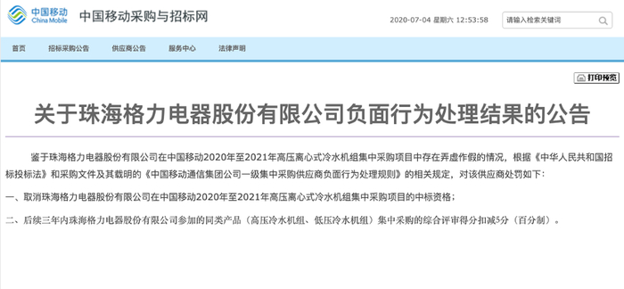 公告称,鉴于格力在中国移动2020年至2021年高压离心式冷水机组集中采购项目中存在弄虚作假的情况,根据《中华人民共和国招标投标法》和采购文件及其载明的《中国移动通信集团一级集中采购商负面行为处理规则》的相关规定,取消格力在中国移动2020年至2021年高压离心式冷水机组集中采购项目的中标资格。