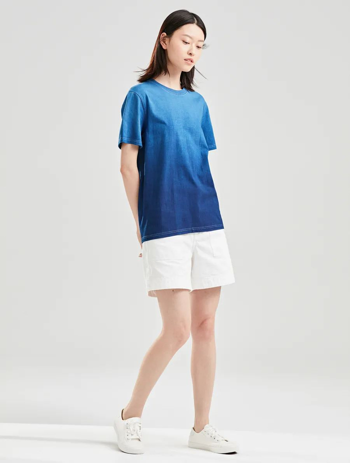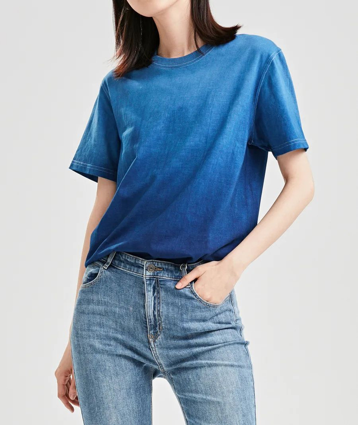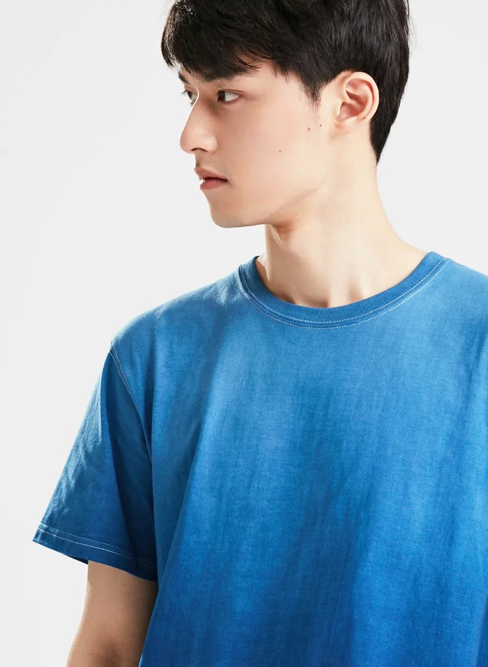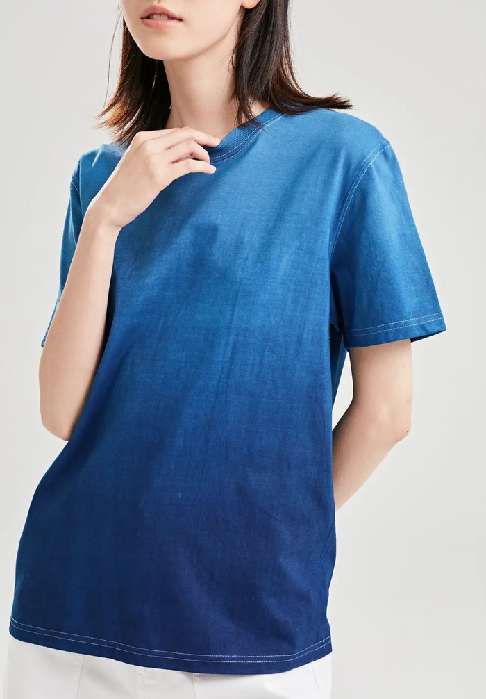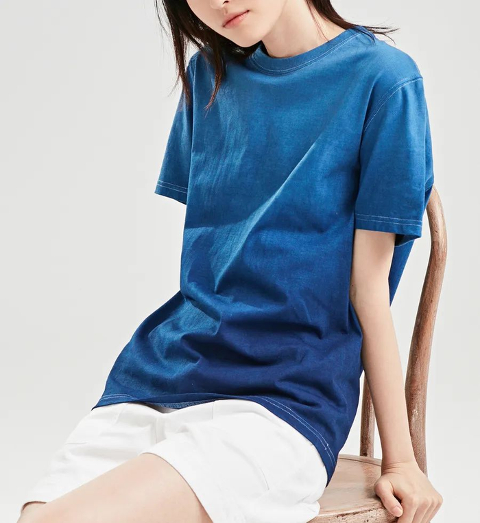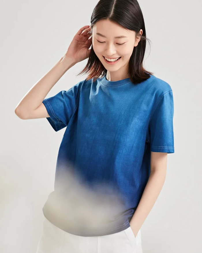 这款蓝染T恤是渐变的效果,颜色在深邃之上,又多了些飘渺的感觉。