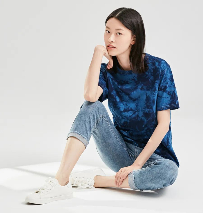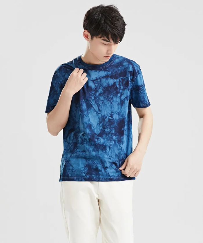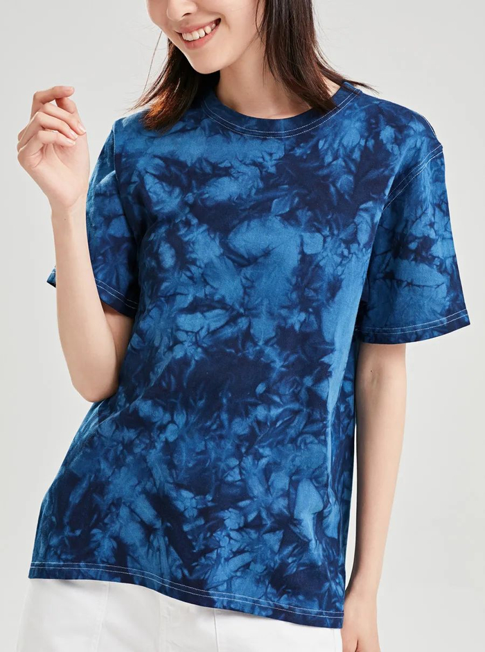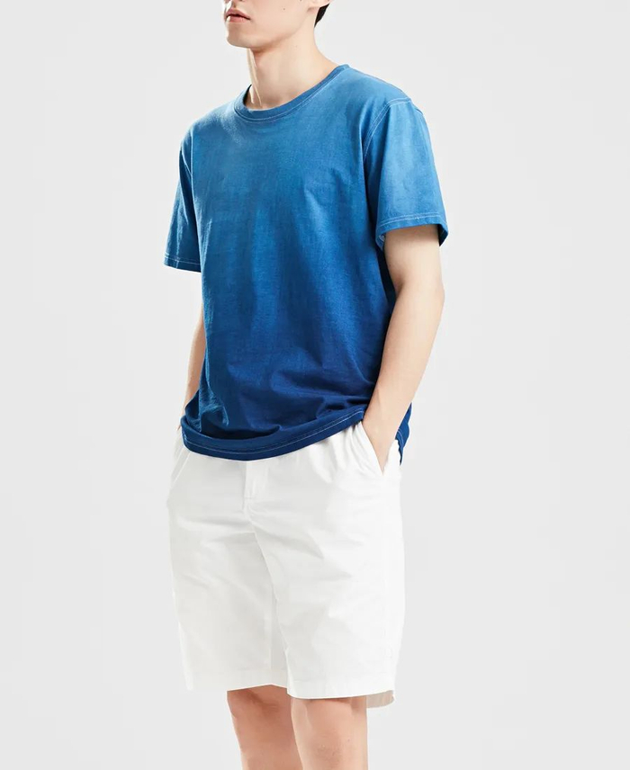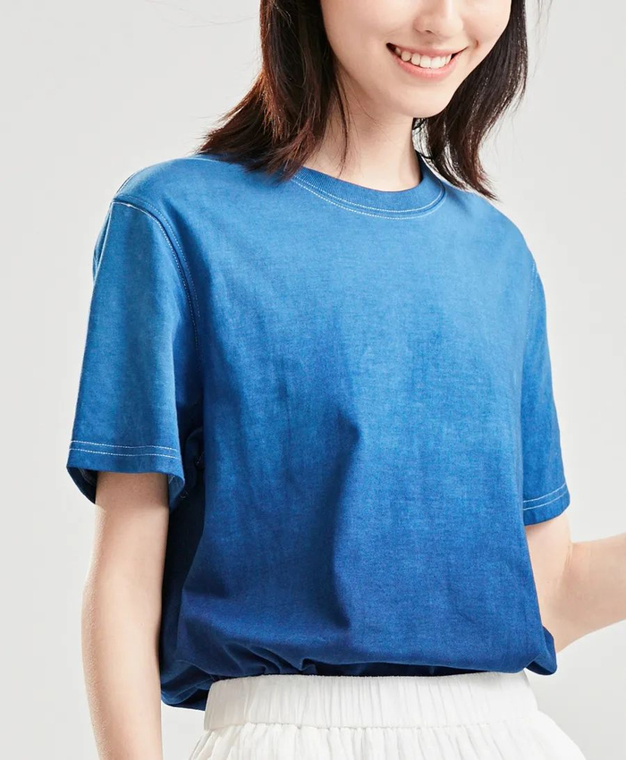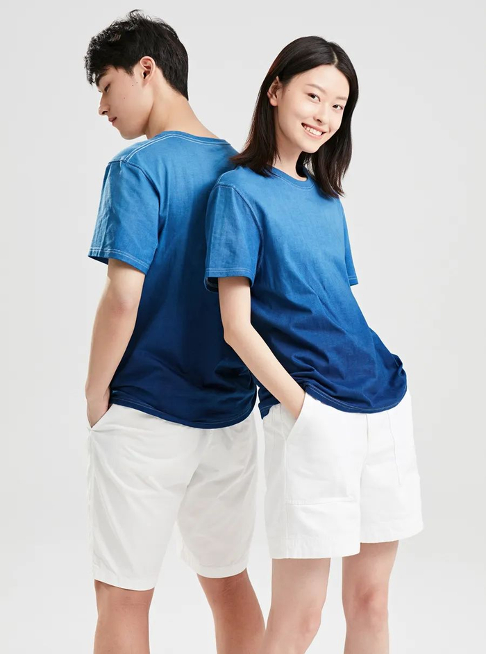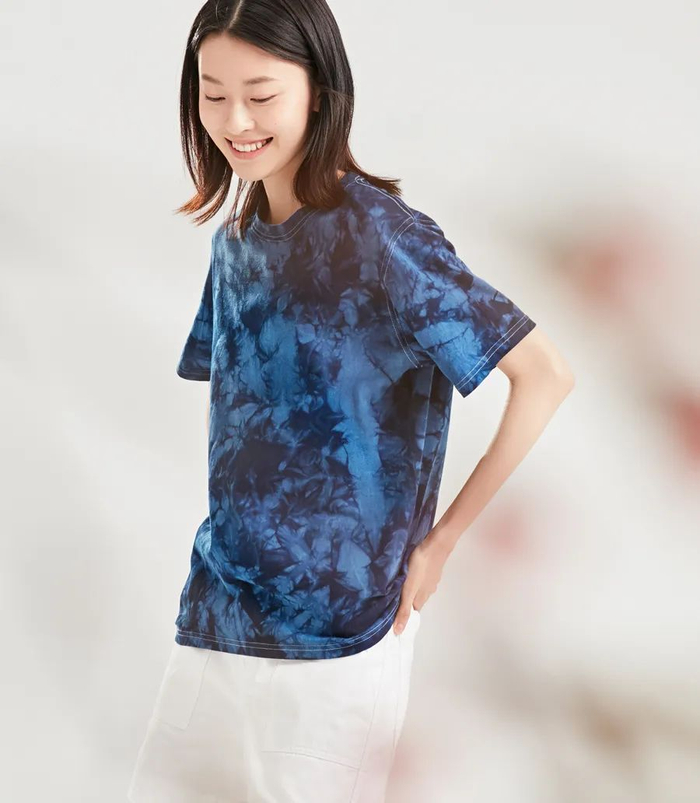 这款蓝染T恤是渐变的效果,颜色在深邃之上,又多了些飘渺的感觉。