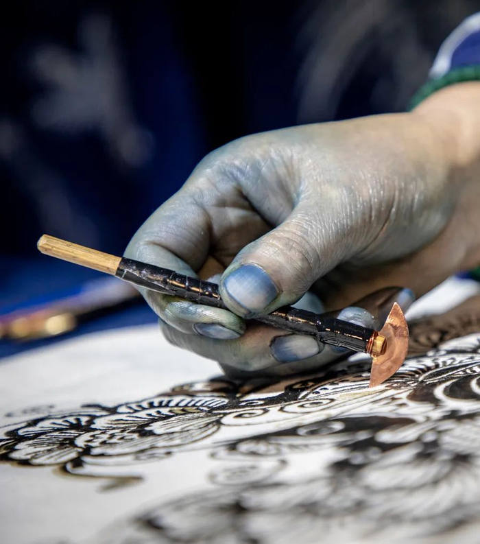 蜡染手艺人像画画那样,让缓缓流出的蜡液在布料上画出图案。