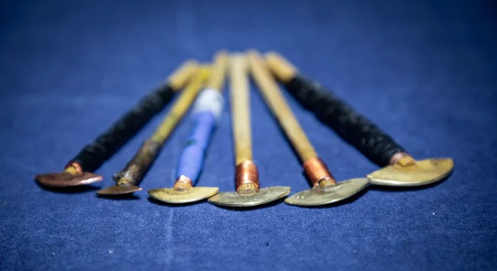 由两片薄铜片组成,刀口微开,蜡液就是蓄在里面,从刀口缓缓流出。