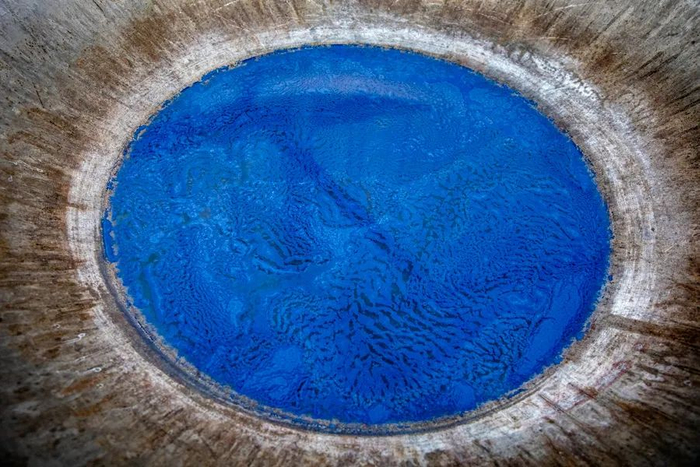 打靛,就是用力不停翻动、捶打水缸里的汁液,直至缸里浮起大量的紫蓝色泡沫。静置1至2天后,就把上端的废水倒出,缸底留下的就是浓稠的天然染料——青靛膏。