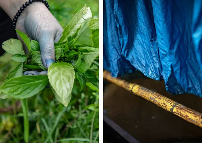 用一种叫做蓼蓝的植物,提取出天然的靛蓝色染泥,再手工重复多次对布料进行染色,才能得到的这种蓝色。