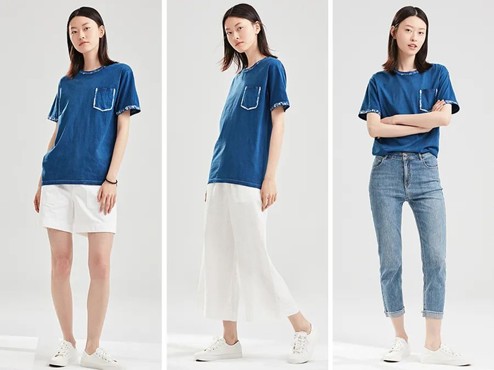 想要凸显蓝染的色彩魅力,最适宜的搭配就是白色的下装,白裤子或者白裙,清爽养眼,看着就很舒服。