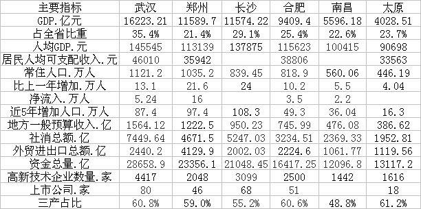 除了总量比较小之外,无论是人均GDP、人均可支配收入,太原在中部几个省会中都是靠后的。在资金总量和高新技术企业这两个重要指标上,太原略胜南昌,但与另外四个城市差距较远。