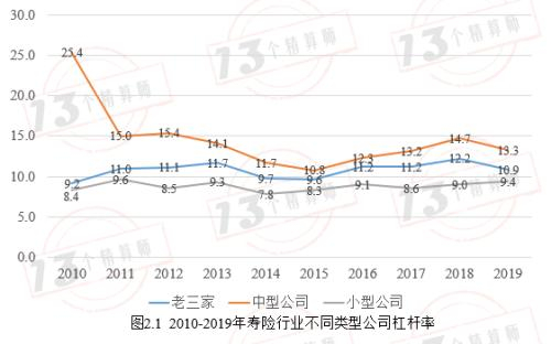 3、“13精”给出了2010-2019年寿险行业不同类型公司的杠杆率。2019年老三家杠杆率10.9,居中位置;中型寿险公司的杠杆率是最高的为13.3,小型寿险公司的杠杆率是最低的仅为9.4。