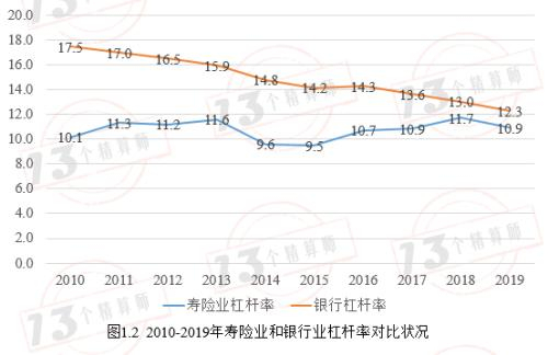 2019年寿险业杠杆率为10.9,银行业杠杆率为12.3。其中,银行业杠杆率是基于中国资本市场上36家上市银行的财务数据计算而得。