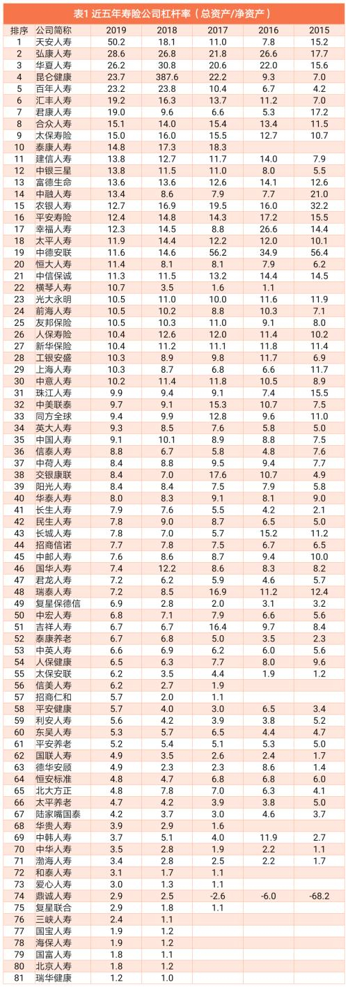 表1给出了近五年寿险公司的杠杆率排行榜。