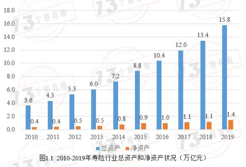 2、2019年寿险行业总资产规模为15.8万亿元,近十年复合增速为17.8%;净资产规模为1.4万亿元,近十年复合增速为16.8%,均呈现出高速发展态势。