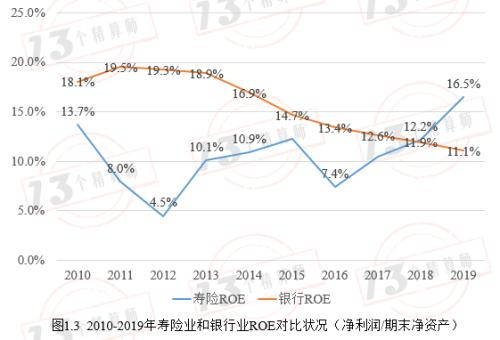 图1.3给出了2010-2019年寿险业和银行业的ROE对比状况。两类行业ROE的计算均是采用净利润除以期末净资产。2019年寿险业ROE为16%,而银行业ROE为11%。