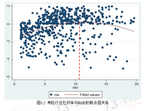 图3.2给出了描述杠杆率与ROE的散点图及拟合曲线,可以很清楚地看到,当杠杆率低于10.8时,杠杆率与ROE正相关;而当杠杆率高于10.8时,杠杆率与ROE又是负相关。