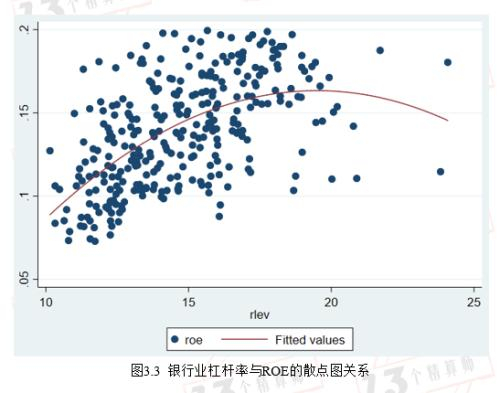 同样我们也检验了银行业杠杆率与ROE之间的关系是否也满足倒“U”型。图3.3给出了银行业杠杆率与ROE的散点图关系。