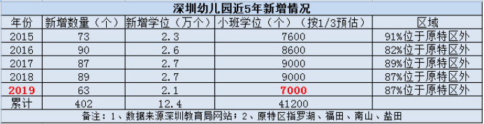 同期来看,深圳教育局网站公布的数据显示,深圳幼儿园增加的数据就要逊色得多。2015年-2019年5年里,幼儿园累计增加的学位只有12.4万个,而同期的适龄入学儿童(对应2012年-2016年的新生儿),则高达34.72万人。