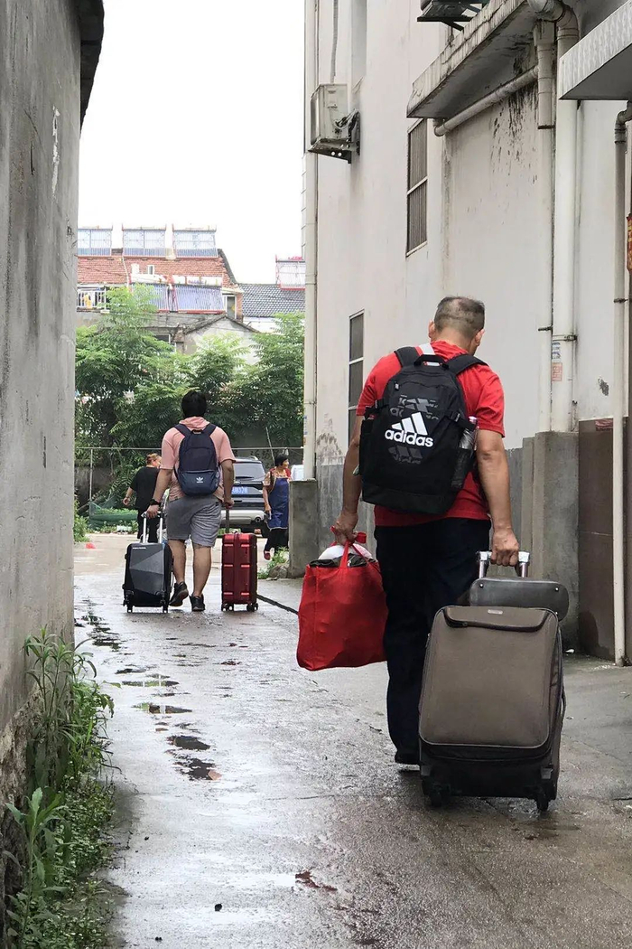 一名陪读爸爸和儿子提箱子离开。