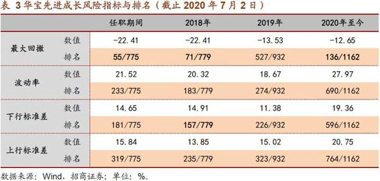 与传统的高弹性成长基金相比不同的是,华宝先进成长也表现出了比较好的抗风险能力。而根据对曾豪的调研,其也将对组合风险的控制(尤其是下行风险)放在重要的位置上。下表罗列了基金主要的风险指标情况,整体而言基金在风险角度体现了如下一些特征: