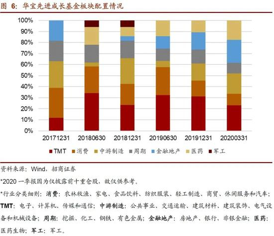 下面我们对基金中报年报所披露的所有持股的行业分类汇总,判断基金偏好的行业及板块。我们首先根据申万一级行业,将个股板块分为周期、中游制造、医药、消费、军工、金融地产、TMT 板块,并根据持仓将基金的板块配置作图如下。
