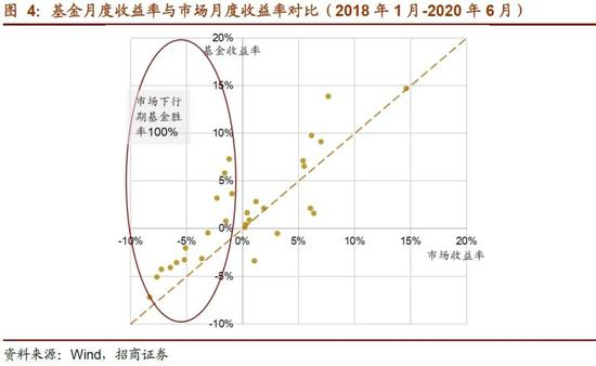 上图中的橙色虚线为y=x,在直线左上方表示基金业绩优于市场,右下方代表基金业绩差于市场。可以看到,基金的收益多数情况下超过市场,胜率达到了83.3%(25/30)。