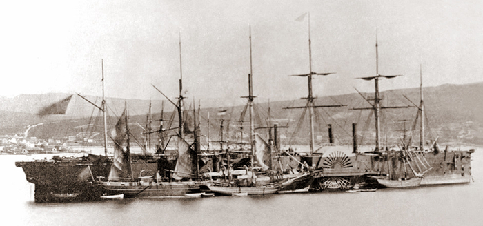 (大东方号轮船在加拿大纽芬兰弗德湾半岛三一港湾,1866年。)
