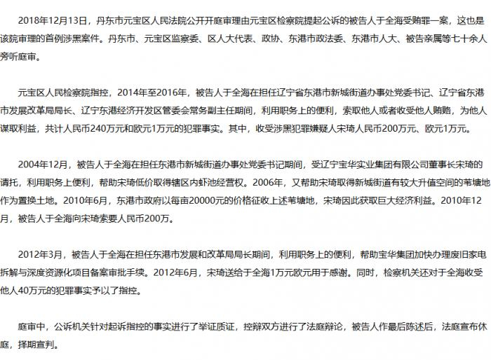 2018年12月,辽宁省高院公告当地元宝法院公开开庭审理首起涉黑案件时,元宝区人民检察院指控,2004年12月,被告人于全海在担任东港市新城街道办事处党委书记期间,受辽宁宝华实业集团有限公司董事长宋琦的请托,利用职务上便利,帮助宋琦低价取得辖区内虾池经营权。2006年,又帮助宋琦取得新城街道有较大升值空间的苇塘地作为置换土地。2010年6月,东港市政府以每亩20000元的价格征收上述苇塘地,宋琦因此获取巨大经济利益。2010年12月,被告人于全海向宋琦索要人民币200万。