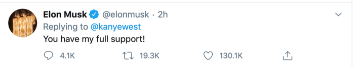 侃爷的朋友——特斯拉CEO埃隆·马斯克也对侃爷表示支持,在侃爷的推特下回复称,“全力支持你!”