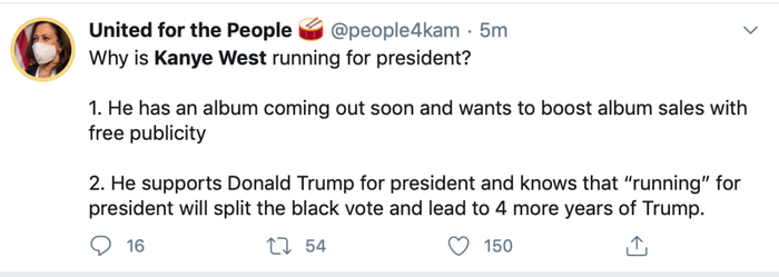 还有网友指出,大家不要被侃爷参选给迷惑了,“他很显然是在帮助特朗普,通过成为第三方候选人分走原本将投票给拜登的黑人选民。这就是戈尔败给了布什的原因”。
