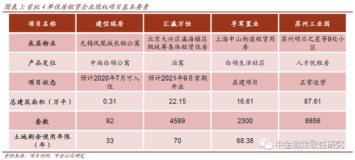 首批4单住房租赁企业股权交易服务试点项目中,除苏州工业园项目资产为人才优租房外,其余项目均为长租公寓,且均处于待运营状态。我们总结了其基本要素如下: