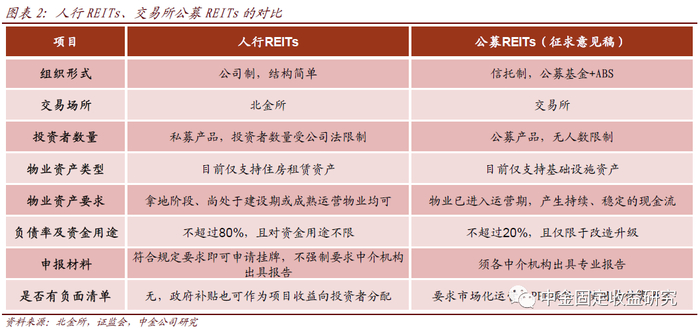 与此前推出的交易所公募REITs相比,人行版REITs在组织形式、交易场所、基础资产类型等各方面都均有一定区别。总体来说,人行版REITs在基础资产、发行流程等方面的要求均更为宽松、简便。