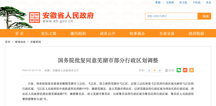 国务院批复同意:安徽芜湖撤销4区县 新设3区